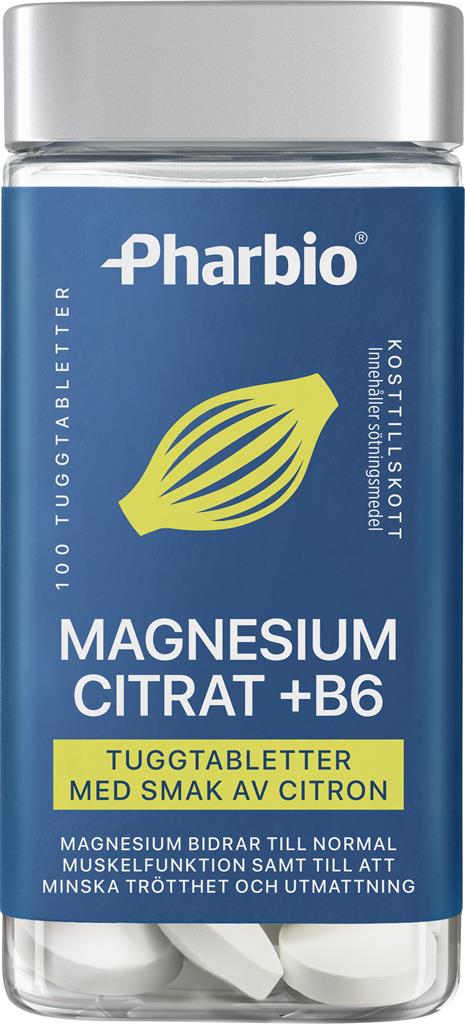 Pharbio Magnesiumcitrat + B6 är ett kosttillskott i tuggtablettform med frisk citronsmak. Varje tablett kombinerar magnesium (från magnesiumcitrat) med vitamin B6. Magnesium bidrar till normal muskelfunktion, elektrolytbalans och normal energiomsättning. Vitamin B6 bidrar till att minska trötthet och utmattning samt till nervsystemets normala funktion. Tuggformatet gör tabletterna enkla att ta utan vatten.