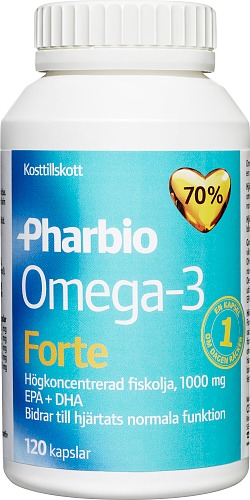 Pharbio Omega-3 Forte är kosttillskott innehållande 1000 mg koncentrerad fiskolja med omega-3 fettsyror i triglyceridform. Andelen omega-3 fettsyror är ca 70%. Produkten vänder sig till konsumenter som inte via kosten får i sig rekommenderade mängd omega-3, dvs. inte äter fet fisk 2-3 gånger per vecka.