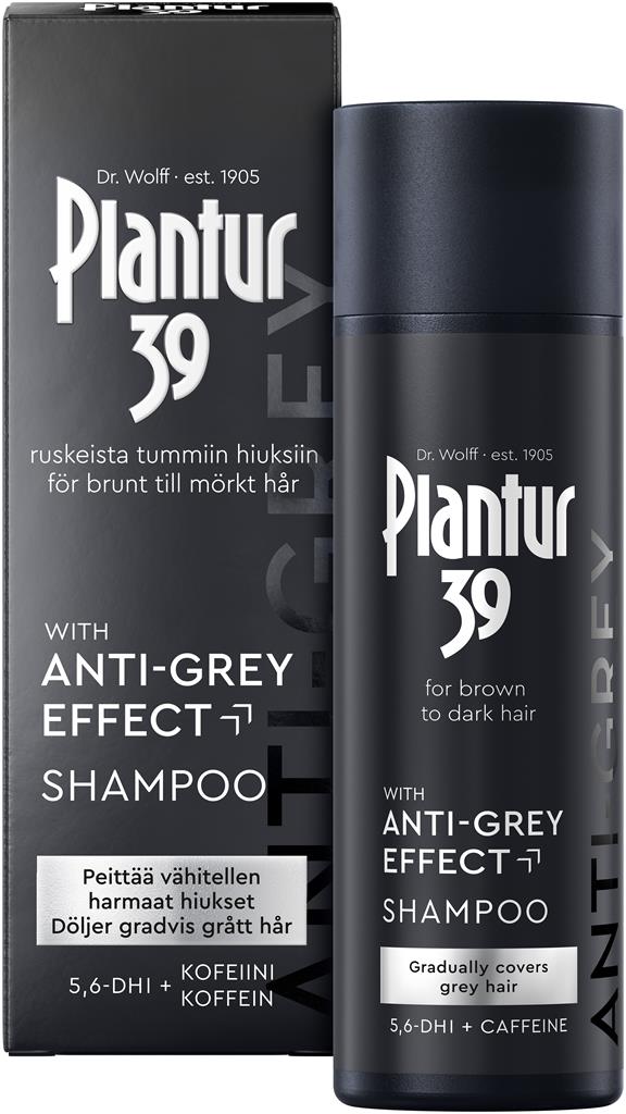Plantur 39 AntiGrey Effect Shampoo har utvecklats speciellt för kvinnor med brunt till mörkt naturligt hår som vill dölja grått hår och utväxten vid hårfästet. Plantur 39 AntiGrey Effect Shampoo fungerar utan aggressiva kemikalier (t.ex. väteperoxid). Färgpigmentet bildas genom en reaktion med syret i luften. Denna naturliga pigmenteringsprocess är mycket skonsammare för håret. De första synliga resultaten kan vanligtvis förväntas efter två till fyra veckors regelbunden användning. Resultaten kan dock variera beroende på hårets individuella tillstånd och den ursprungliga hårfärgen. Plantur 39 AntiGrey Effect Shampoo fungerar i både naturlig hårfärg och färgat eller tonat hår. Plantur 39 AntiGrey Effect Shampoo kan användas varje dag. Schampot ska verka i två till fem minuter. Den aktiva ingrediensen 5,6DHI ansamlas i håret under schamponeringen, reagerar med luftens syre och bildar ett färgpigment. På så sätt skapas en permanent färgeffekt som inte tvättas ur utan växer med håret.