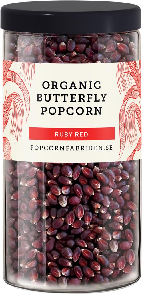 Organic Butterfly Popcorn Ruby Red är ekologiska popcornkärnor från röd majs.