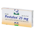Postafen används till vuxna, ungdomar och barn över 6 år vid åksjuka (bil-, buss-, flyg- och sjösjuka). Meklozin som är det verksamma ämnet i Postafen är ett antihistamin som dämpar innerörats funktioner som har med balansen att göra och ger på så sätt effekt mot illamående och kräkningar. Effekt efter cirka 1 timme och verkningstiden är cirka 12 timmar. Läs alltid bipacksedeln noga eller gå in på fass.se för mer information.