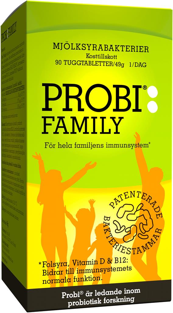 Probi® Family innehåller de patenterade och kliniskt testade bakteriestammarna Lactiplantibacillus plantarum HEAL9 (HEAL9®) och Lacticaseibacillus paracasei 8700:2 (L. paracasei8700:2®). Kosttillskottet innehåller även folsyra, vitamin D och vitamin B12, som bidrar till immunsystemets normala funktion. Kommer i form av välsmakande tuggtabletter och kan tas av vuxna och barn från 3 år.