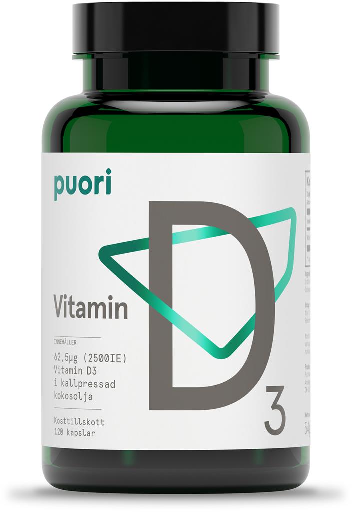 Puori D3 2500 IE Puori är kosttillskott med D-vitamin löst i kallpressad kokosolja för maximal absorption. D-vitamin hjälper till att bygga upp och bibehålla en stark benstomme och bidrar till immunförsvarets normala funktion. Varje kapsel innehåller 62,5 ug (2500 IE) vitamin D3.