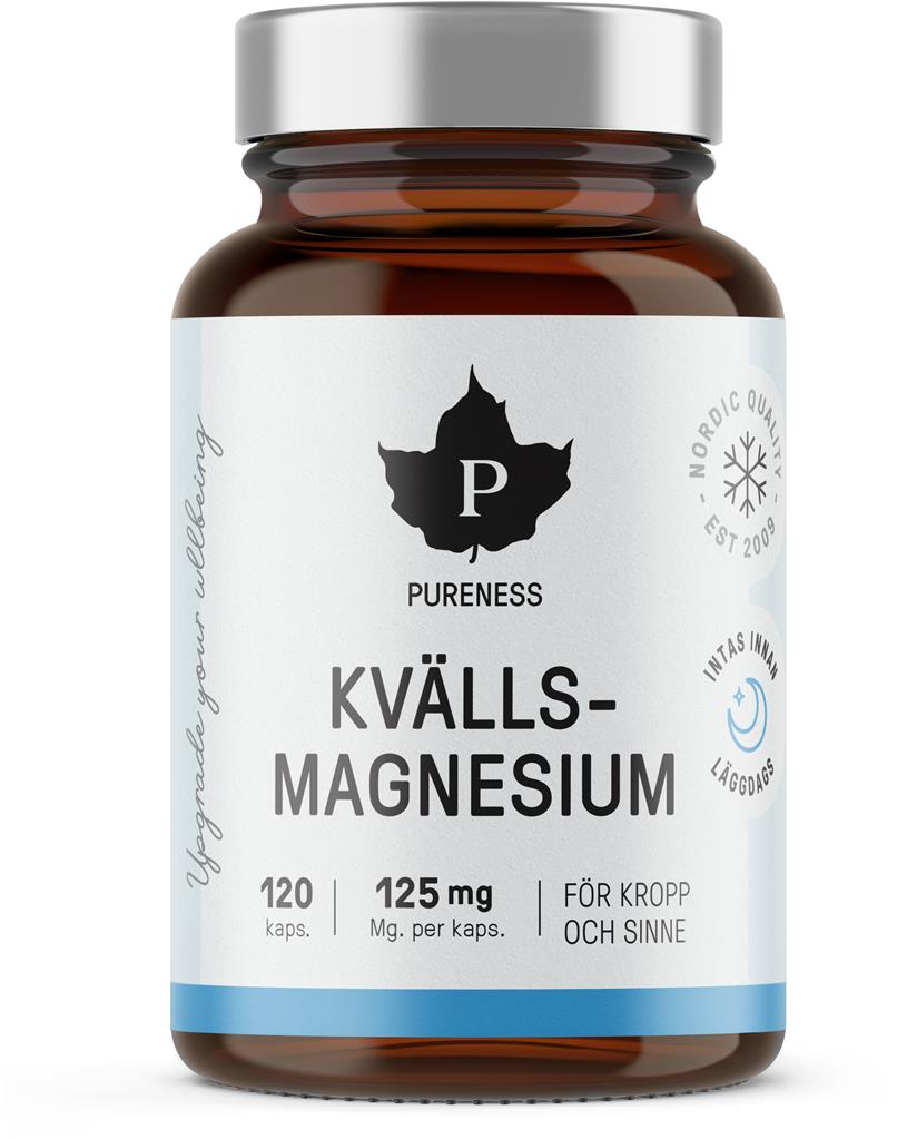 Pureness Kvällsmagnesium är ett magnesiumtillskott med örtextrakt framtaget för att bidra till bättre sömn. Magnesiumbisglycinat är skonsam mot magen, tas lätt upp i kroppen och har en lugnande effekt tack vare aminosyran glycin, som är bunden till magnesiumet och agerar som en lugnande signalsubstans i kroppen.