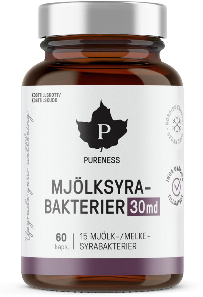 Mjölksyrabakterier 30 md från Pureness innehåller totalt 30 miljarder mjölksyrabakterier per kapsel, fördelat på 15 olika bakteriestammar. Produkten innehåller även inulin och fruktooligosackarider, som mjölksyrabakterier behöver för att hålla sig vid liv. Kapslarna är vegetabiliska och avsedda för dagligt intag eller för kortare perioder.