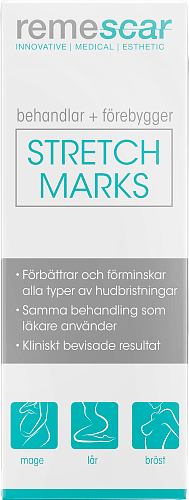Remescar Stretchmarks är en silikonbaseradkräm som förebygger och behandlar hudbristningar, genom att bilda en genomskinlig tunn, skyddande silikonbaserad hinna. Produkten skyddar huden och lindrar inflammation och stimulerar till läkning.
