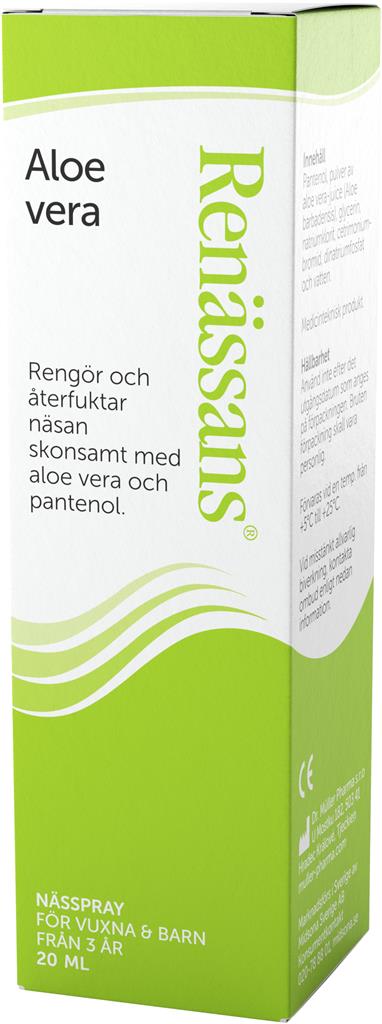 Renässans Aloe Vera är en saltvattenspray som också innehåller Aloe Vera. Renässans Aloe Vera kan med fördel användas vid vistelse i torra miljöer och vid förkylning kan näsan klia och upplevas torr.