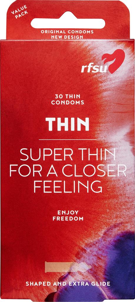 RFSU Thin kondom är en tunn kondom för en närmare känsla med extra glidmedel. Thin kondom är en ofärgad, profilerad latexkondom med en slät yta. Behållaren ger ett extra utrymme i toppen.