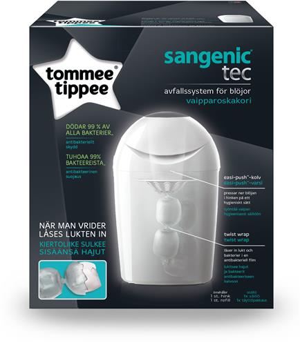 Sangenic TEC är en patenterad blöjhink som erbjuder ett artibakteriellt skydd mot bakterier och dålig lukt och gör att du slipper springa till soptunnan så ofta. Upp till 28 blöjor kan förvaras i hinken innan den behöver tömmas i den vanliga soptunnan. Twist & Seal systemet snurrar in och förseglar varje blöja en och en i kraftig plast som dödar 99% av alla illaluktande bakterier.