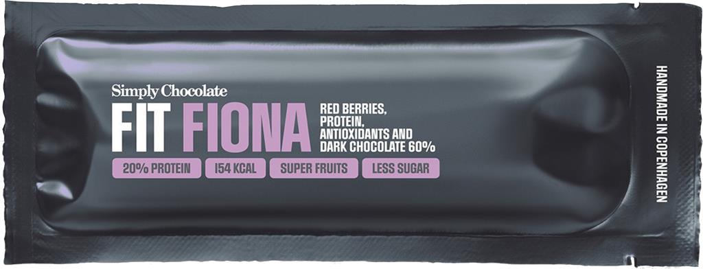 Proteinbar Fit Fiona är en frisk och söt proteinbar. Under ett lager av 60% mörk choklad bjuder baren på en fruktig smakupplevelse av tranbär, blåbär, hallon och svarta vinbär. Fit Fiona är handgjord och hjälper dig att hålla energinivån uppe. Proteinbaren är glutenfri och innehåller hela 20% protein.