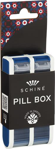 Schine Pill Box S erbjuder ett nytt sätt att förvara/dosera tabletter. Med jalusiluckor öppnar och stänger du enkelt utan besvärande utskjutande delar. Small är en box med 8 fack vilka kan användas efter behov. Till exempel dosera för en vecka med ett extrafack eller ladda boxen inför helgresan. En rejäl förvaring i behändig storlek som är lätt att ta med. Transparenta luckor och färgad botten gör det enkelt att se om facket är fyllt. Schine Pill Box S finns i två färger, röd och blå.