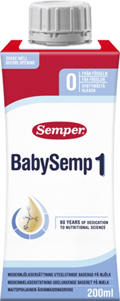 BabySemp 1 är en drickfärdig modersmjölksersättning baserad på mjölk, avsedd för spädbarn från födseln upp till 6 månaders ålder. Produkten kan ges som ersättning för eller som komplement till bröstmjölk, men endast efter rekommendation från BVC eller barnläkare. BabySemp 1 täcker spädbarns näringsbehov från första levnadsveckan upp till 6 månaders åldern och innehåller DHA. För barnets hälsa är det viktigt att alltid följa tillrednings- och förvaringsanvisningarna på förpackningen.
