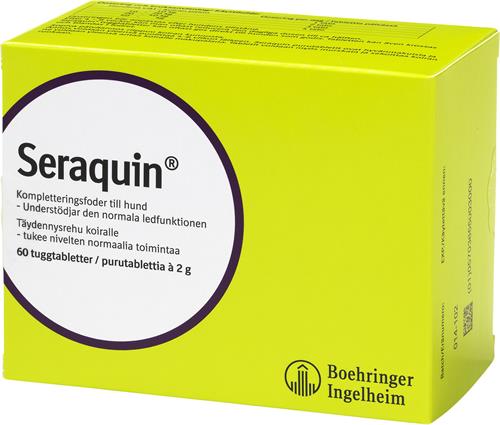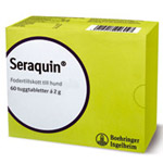 Seraquin är ett naturligt fodertillskott som innehåller glukosamin och understödjer den normala funktionen i ledbrosk, ledkapslar, senor och ledband hos hundar och katter. Den styrker och underhåller rörelseapparaten och håller djuret friskt och aktivt. Seraquin smakar riktigt gott och de flesta djur äter dem som en godbit.