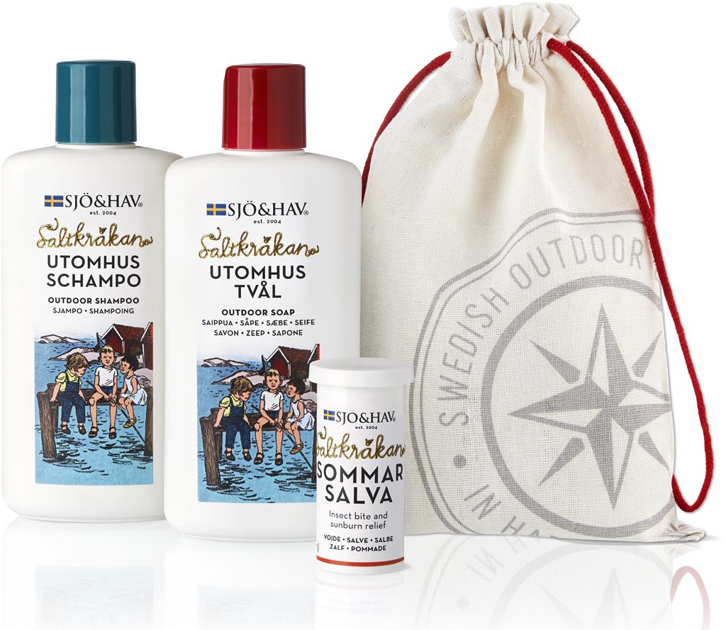 Saltkråkan-kit för utomhusbruk med tvål, schampo och sommarsalva.