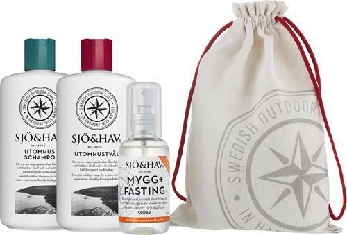 Sjö&Hav Sommarkit 1 består av tre utvalda hygienprodukter unikt utvecklade för utomhusbruk. Produkterna kommer i en bomullspåse med dragsko. Sjö&Hav Sommarkit 1 innehåller Utomhustvål 200 ml, Utomhusschampo 200 ml, Mygg+Fästing Spray 75 ml. Svensktillverkade. Lätt biologiskt nedbrytbara för minimal inverkan på känslig miljö.