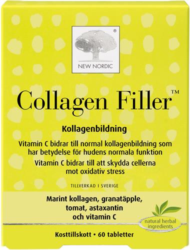 Skin Care Collagen Filler är ett kosttillskott baserat på marint kollagen, granatäpple, tomat, astaxantin och ceramider.