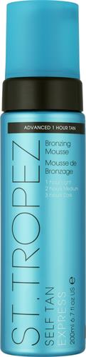 St.Tropez Self Tan Express Bronzing Mousse är en av St.Tropez mest avancerade och snabbverkande solprodukter hittills. Du kan applicera den, duscha och vara klar på så lite som en timme. Denna lättanvända och snabbtorkande brun-utan-sollotion absorberas snabbt av huden. Du väljer själv vilken hudton du vill få genom att vänta längre eller kortare tid (1-3 timmar) innan du sköljer av vägledningsfärgen.