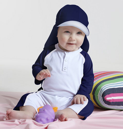 Soldräkt för baby. Soldräkten är snabbtorkande, sval och luftig samt salt- och klorbeständig. UV-dräkten har långa ärmar och ben för bästa skydd. Grenen är försedd med tryckknappar för att underlätta vid blöjbyten. Tryckknappar i halsurringning för att göra på och avklädning så behändig som möjligt.