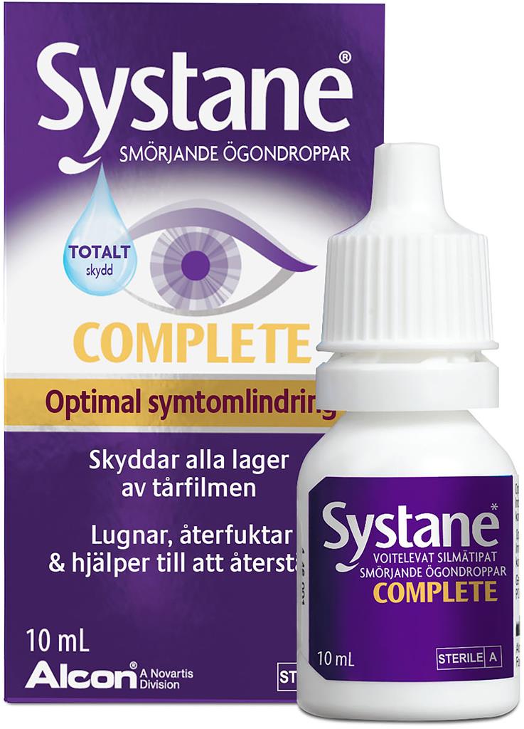 SYSTANE® COMPLETE dämpar symtomen, återfuktar och ger optimal lindring till ögat. Rekommenderas till alla typer av torra ögon.  SYSTANE® COMPLETE har en unik verkningsmekanism som ger optimalt med fukt och lipider till tårfilmen. Lipiddroppar i nanostorlek reparerar och fyller ut defekter i tårfilmen. Bidrar därmed till att återuppbygga och stabilisera tårvätskans struktur. Kan användas vid behov under hela dagen, för att behandla torra ögon. Det kan också användas före och efter användande av kontaktlinser. SYSTANE COMPLETE smörjande ögondroppar är till utseende naturligt vit innan applicering Omskakas väl före användning. Placera 1 eller 2 droppar i ögat (ögonen) efter behov och blinka. Kan användas i upp till 3 månader efter att flaskan har öppnats. Kassera all överbliven emulsion 3 månader efter det att flaskan har öppnats.