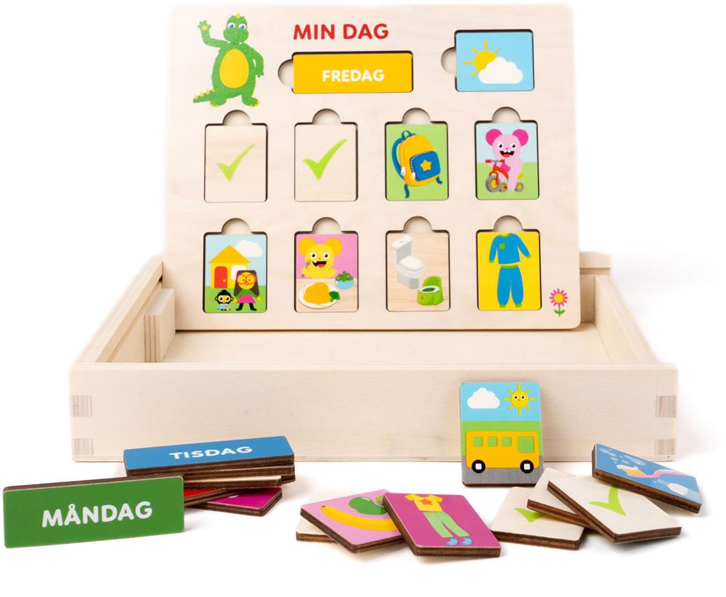 kalenderdagar, en dag -och nattbricka, samt 20 brickor med aktiviteter.  godkänt enl. EN71 från 1 år.