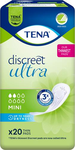 TENA Lady Discreet Mini är diskreta bindor med microPROTEX™ för mindre urinläckage, absorberar betydligt mer än en vanlig binda. En silkeslen yta närmast kroppen håller huden torr och den assymetriska formen gör skydden bekväma och diskreta. Fresh Odour Control med unika aktiva micro-fresh pärlor reducerar utvecklingen av lukt.