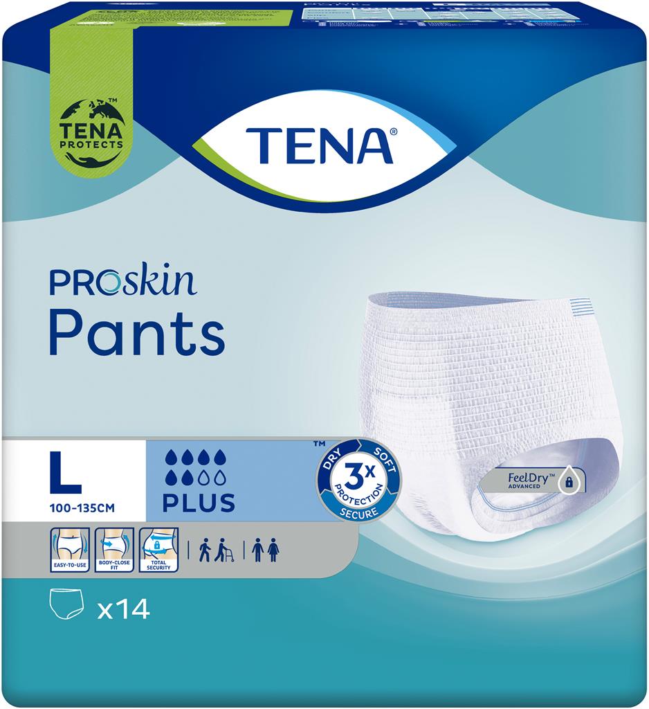 TENA Pants Plus för män och kvinnor är ett Svanenmärkt mjukt byxskydd för engångsbruk med bekväm passform. Passar för medelstora till stora urinläckage. Urin absorberas mycket snabbt och effektivt tack vare vår tunna och flexibla kärna med två absorptionskanaler. Skyddet har utformats med integrerade läckagebarriärer för att ge den extra säkerhet som håller dig torr, säker och trygg.  Odour Neutraliser i kärnan minimerar risken för oönskad lukt. TENA Pants Plus är andingsbara för att främja en god hudhälsa.