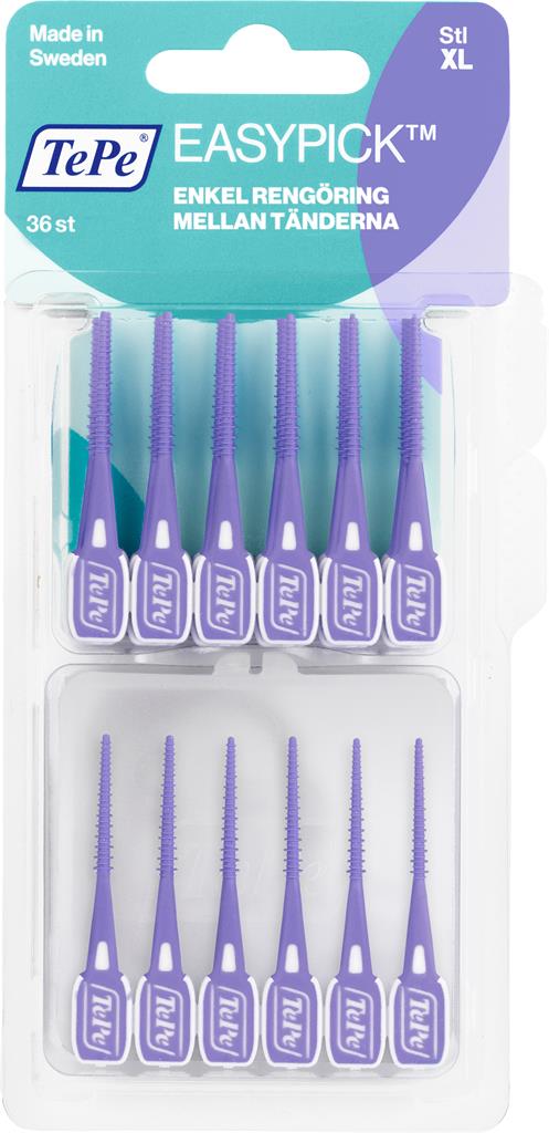 TePe EasyPick är en tandpetare i plast. Hela rengöringsdelen är täckt av unika lameller av silikon. De breda lamellerna i kombination med den långa arbetsdelen rengör effektivt mellan tänderna. Enkelt att komma åt även mellan de bakre tänderna. Följ anvisningarna på produkten/bruksanvisningen.