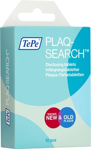 TePe PlaqSearch™ är ett smart infärgningssystem som kan skilja mellan ny och gammal plack (äldre än 12 timmar). Röd färg indikerar ny plack och blå färg gammal plack som inte borstats bort vid senaste tandborstningen. PlaqSearch har en mild smak av tuttifrutti.