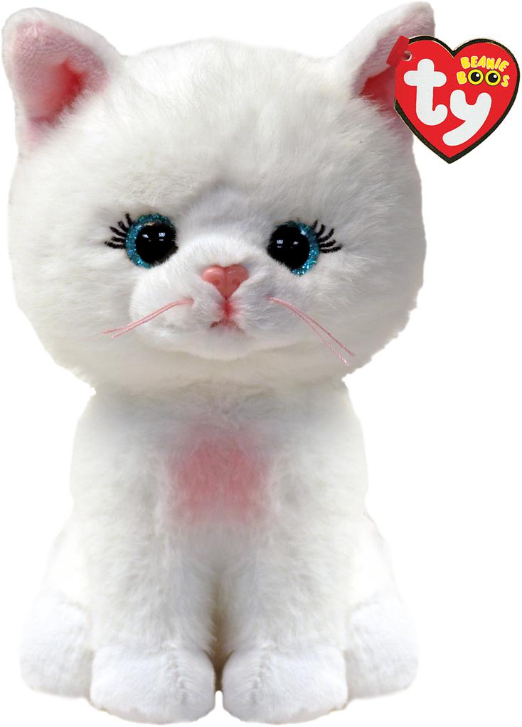TY Beanie Boos Amelia Cat är ett mjukt gosedjur med vit päls, stora ögon och ett vänligt uttryck. Den gosiga ytan och storleken på cirka 15 cm gör gosedjuret lätt att hantera och enkel att ta med.