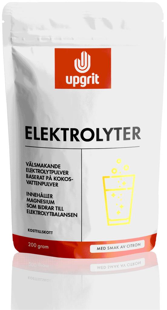 Upgrit Elektrolyter Citron är ett elektrolytpulver baserat på kokosvattenpulver och havsmineraler. Produkten innehåller magnesium som bidrar till elektrolytbalansen samt C-vitamin från naturliga ingredienser. Pulvret löses i vatten och ger en fräsch dryck som kan användas i samband med din morgonpromenad, under träningen eller när som helst på dagen du önskar en läskande dryck som passar din livsstil.