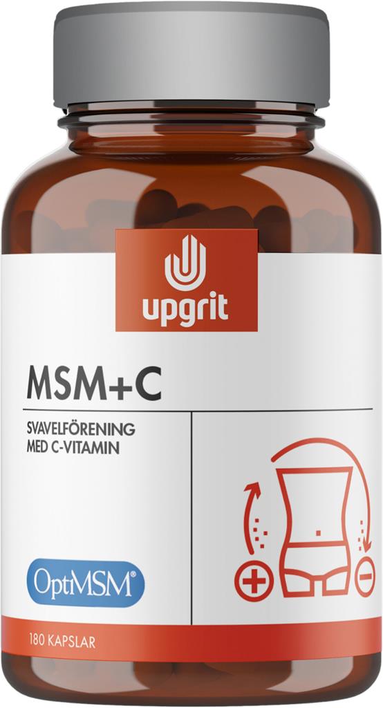 Upgrit MSM + C innehåller MSM (metylsulfonylmetan) i form av OptiMSM® samt vitamin C från kalcium-L-askorbat. MSM finns naturligt i kroppen och är en form av organiskt svavel. Det är inte ovanligt att MSM sätter igång magen och av den anledningen är rekommendationen att börja med en låg dos. MSM har en effekt på hudens fasthet, elasticitet och återfuktning.