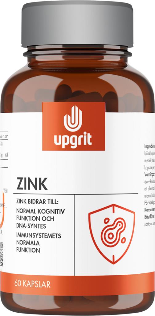 Upgrit Zink innehåller zink i en lättupptaglig form. Zink är ett essentiellt mineral som deltar i många processer i kroppen och bidrar bland annat till immunsystemets normala funktion, normal ämnesomsättning samt till att bibehålla normalt hår, hud och naglar.