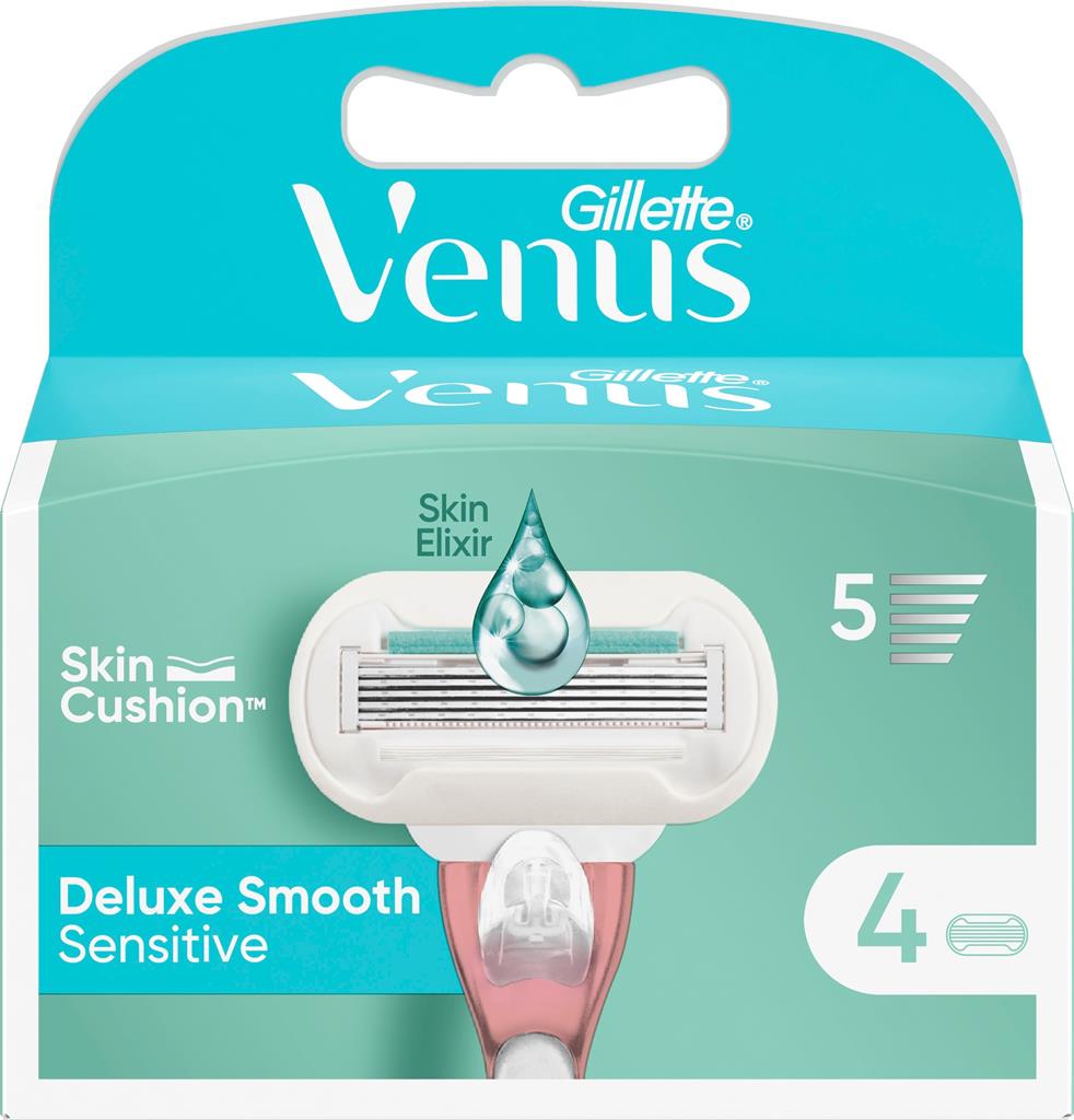 Gillette Venus Extra Smooth Sensitive rakblad för kvinnor med SkinElixir är perfekt för att skydda din känsliga hud. Kombinationen av lubrastrip med SkinElixir, fuktremsan och de 5 extra tunna bladen med diamantliknande beläggning ger slät hud.