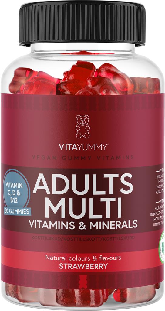 VitaYummy Adults Multi Strawberry innehåller en kombination av vitaminer och mineraler, däribland vitamin A, D, E, B12 och jod. Produkten är vegansk och fri från artificiella färg- och smakämnen. Den naturliga färgen kommer från morots- och svartvinbärskoncentrat.