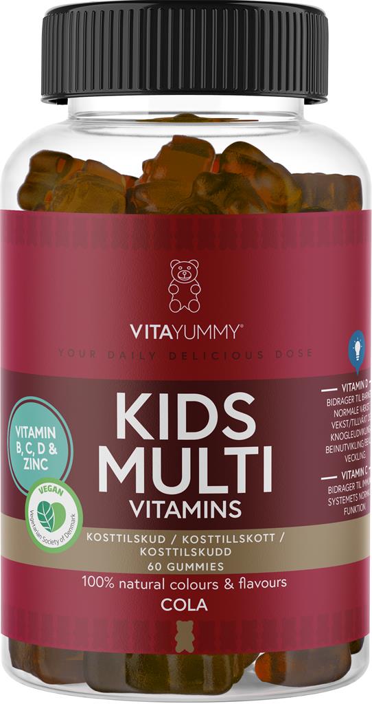 VitaYummy Kids Multivitamins är en vegansk kosttillskott för barn som innehåller flera vitaminer som bidrar till kroppens normala funktioner. Tuggvitaminen i form av gummibjörnarna innehåller bland annat vitamin A, D, E, Jod och B12 som alla bidrar till immunsystemets normala funktion. De välsmakande vingummi innehåller bland annat A vitamin som bidrar till att bibehålla normal syn, hud och slemhinnor, samt D vitamin  som bidrar till att bibehålla normal benstomme, tänder och muskelfunktion. Produkten innehåller även vitamin B12 som bidrar till att minska trötthet och utmattning och är ett viktigt vitamintillskott för personer med en växtbaserad kost. Med god smak av Cola och fri från konstgjorda färger. Från 3-11 år.