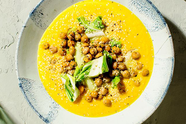 Mixa tills helt slätt med stavmixer, eller häll över i en blender och kör tills du har en slät och krämig soppa. Smaka av med vinäger, salt och peppar, och späd med mer vatten och du vill ha en tunnare soppa. Tillsätt till sist örterna och pulsa ett par gånger. Servera soppan med de rostade kikärtorna och blomkålsblasten.