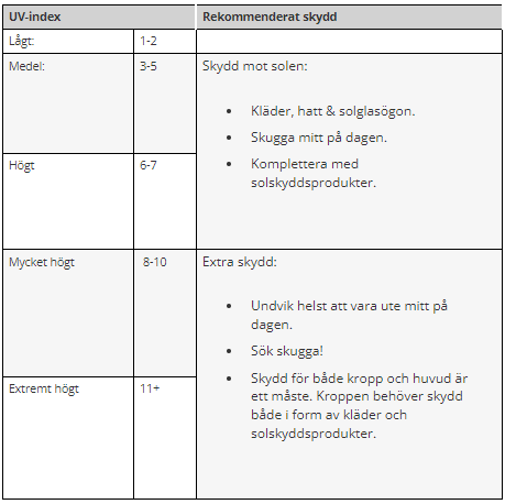 Solstyrkan kan mätas med hjälp av UV-index. Det är ett mått på hur stark solen är och ger en indikation om hur mycket skydd du behöver. Årstiden styr hur stark strålningen är. Skalan för UV-index delas in från 0-11+: