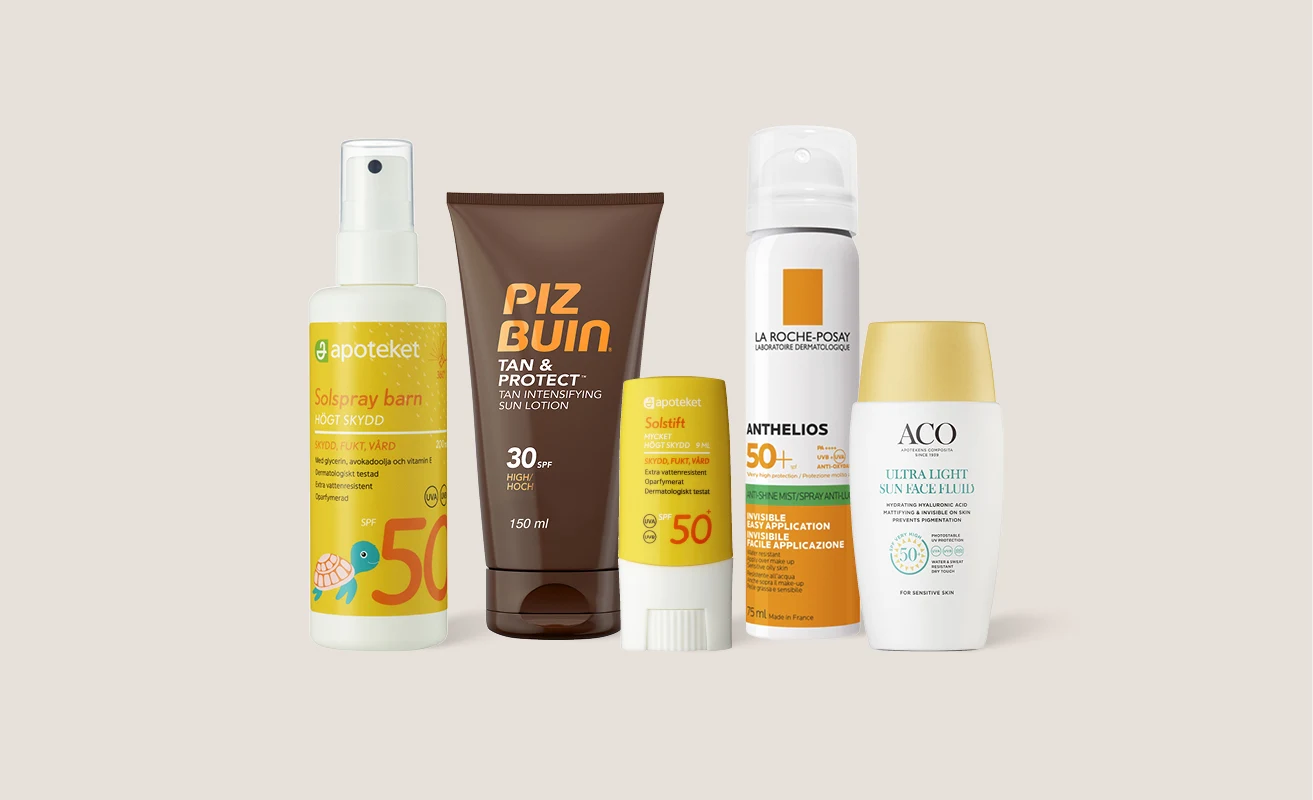 En annan sak du kan tänka på är att välja ett solskydd som har de egenskaperna du vill ha. Kanske har du en viss hudtyp – normal, torr eller fet? Eller har du kanske något hudbesvär du behöver ta hänsyn till? På Apoteket hittar du solskydd som passar din hud och plånbok, både för ansikte och kropp. Behöver du mer råd är du varmt välkommen in till våra apotek för att få vägledning!