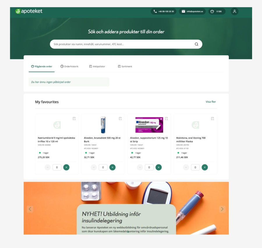I e-handeln för vården kan du som jobbar inom vården beställa era läkemedel, apoteksprodukter och förbrukningsartiklar på ett smidigt och enkelt sätt. Bli företagskund redan idag och få tillgång till Apotekets kundservice med specialistkompetens och många andra vardagsnära tjänster och utbildningar för vårdgivare och vårdpersonal.