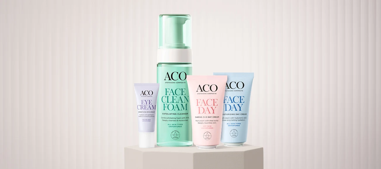 Inom ansikts- och hudvård är ACO speciellt populära för sina milda och skonsamma produkter. I över 75 år har man arbetat med vårdande ingredienser som du ska kunna använda dagligen – från rengöring till återfuktning. Speciellt populära är ansikts- och kroppsprodukterna.