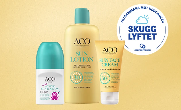 ACO & Apoteket skänker gemensamt 2 kr till cancerfonden för varje såld solskyddsprodukt från ACO i perioden 19/5-22/6 2025.
