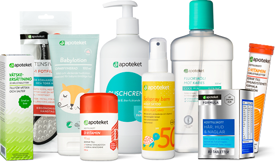 Under Apoteket erbjuder vi ett bassortiment med produkter som är både effektiva och skonsamma. Här hittar du till exempel hudvårdsprodukter, tandkräm, solprodukter, olika självtester, plåster och kosttillskott.