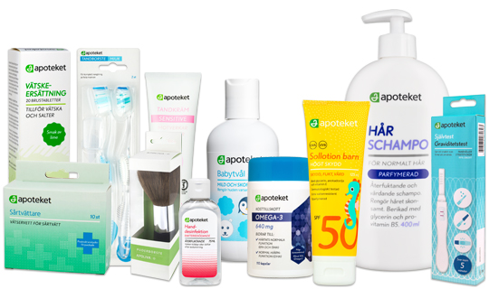 Under Apoteket erbjuder vi ett bassortiment med produkter som är både effektiva och skonsamma. Här hittar du till exempel hudvårdsprodukter, tandkräm, solprodukter, olika självtester, plåster och kosttillskott.