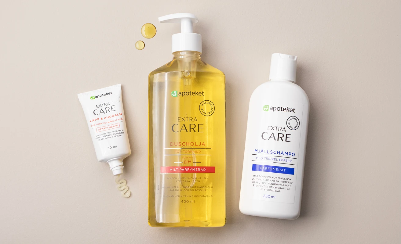Apoteket Extra Care är en serie med hud- och hårvårdsprodukter för torr och känslig hud. Här hittar du allt från duscholjor, bodylotion och mjukgörande krämer till läpp- och hudbalm samt produkter för torr hårbotten. En omtänksam serie för daglig vård av både hud och hår.