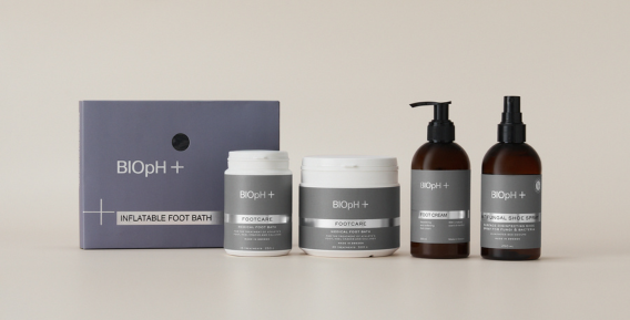 Ge dina fötter den omtanke de förtjänar med BIOpH+ en komplett fotvårdsserie som behandlar, stärker och skyddar. Vårt medicinskt utvecklade fotbad motverkar vanliga fotproblem som fotsvamp, hälsprickor och förhårdnader med bevisad effekt. Den vårdande fotkrämen ger intensiv återfuktning, lugnar torra och irriterade fötter samt hjälper till att mjuka upp förhårdnader och främja läkningen av sprickor. För att förebygga återinfektion av fotsvamp innehåller serien även en desinfektionsspray som eliminerar 99,9 % av alla bakterier och mikroorganismer. Med BIOpH+ får du en aktiv och problemlösande behandling som ger dig friska, naturliga och stolta fötter – varje dag.