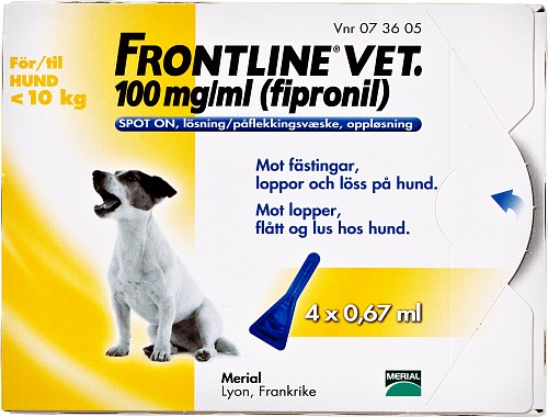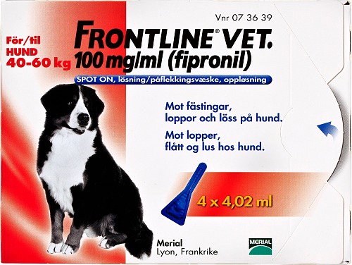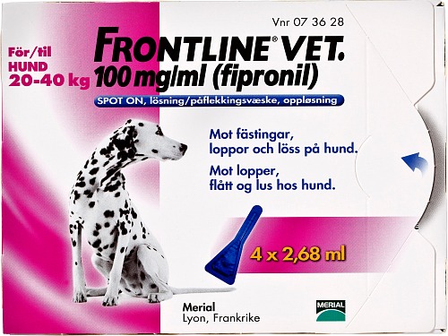 Frontline är ett receptfritt läkemedel för hundar och katter. Läkemedlet finns i ett flertal olika koncentrationer beroende på djurtyp och viktklass, läs bipacksedeln noga innan användning och följ instruktionerna.