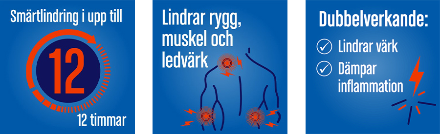 Ipaflex är ett receptfritt läkemedel som lindrar ryggvärk, muskelvärk och ledvärk effektivt. Läkemedlet ger smärtlindring i upp till 12 timmar. Ipaflex är dubbelverkande: Lindrar smärta och dämpar inflammation. Från tillverkaren av Ipren®. För vuxna och ungdomar från 12 år.