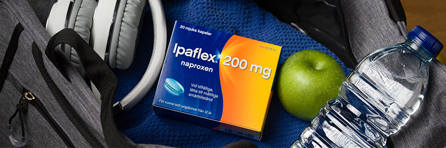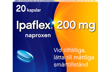Ipaflex (naproxen) mjuk kapsel 200 mg. Läkemedel vid tillfällig lätt till måttlig smärta. Från 12 år. Kontakta läkare om symtomen försämras eller inte förbättras inom 5 dagar vid smärta. Läs alltid bipacksedeln, särskilt vid överkänslighet, annan sjukdom, graviditet, amning. © McNeil Sweden AB, Box 4007, 169 04 Solna, 2022.
