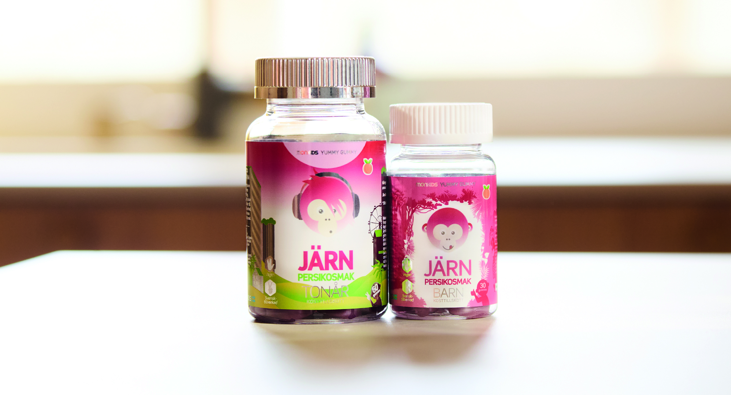 Monkids Järn gummyn har en naturlig god smak av persika, är skonsam mot magen, kompletterar kosten med järn, är helt vegansk och tillverkas i Sverige.