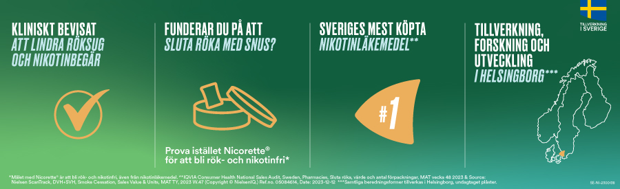 1IQVIA & Nielsen ScanTrack, Value & Unit Sales 1000, w48, 2023 2Studieresultat visar 3-5% rökfria under 6-12 månader. 3Jämfört med enbart viljestyrka. 4Målet med Nicorette är att bli rök- och nikotinfri, även från nikotinläkemedel. 5Samtliga beredningsformer tillverkas i Helsingborg, undantaget plåster.